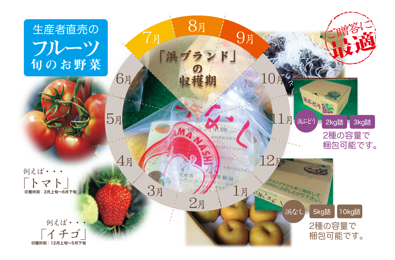 「浜なし」「浜ぶどう」は市場出荷をせず、ほぼ全量を生産者農園の庭先などでの直売で販売しているため、スーパーや青果店ではお買い求めになれません。その反面、生産者が直に選んだ新鮮でおいしい果実を、食べごろの時期を逃さずに味わっていただくことができ、贈答品などとして親しまれています。是非、地元名産「浜ブランド」の旬の果物をご賞味ください。栽培農家は、講習会・巡回検討会などを地区ごとに行い、品質の向上と栽培技術の習得に努めています。また、規格や出荷容器などを統一し「浜なし」「浜ぶどう」ブランドのよりいっそうの定着に努めています。
