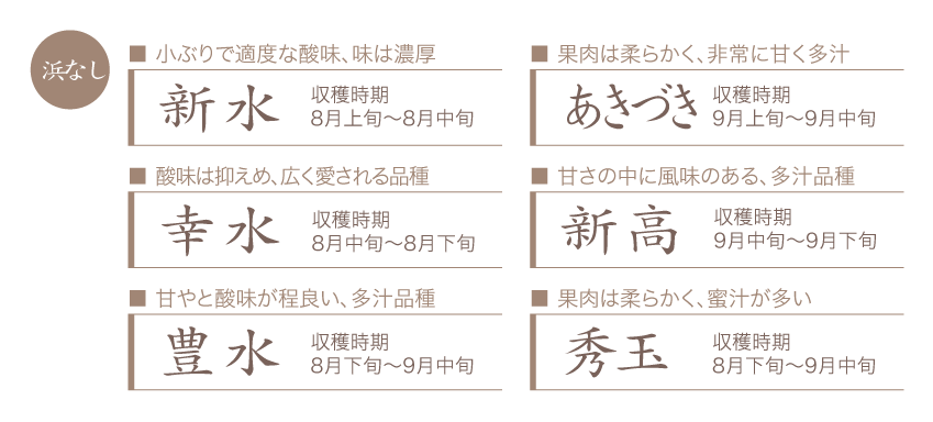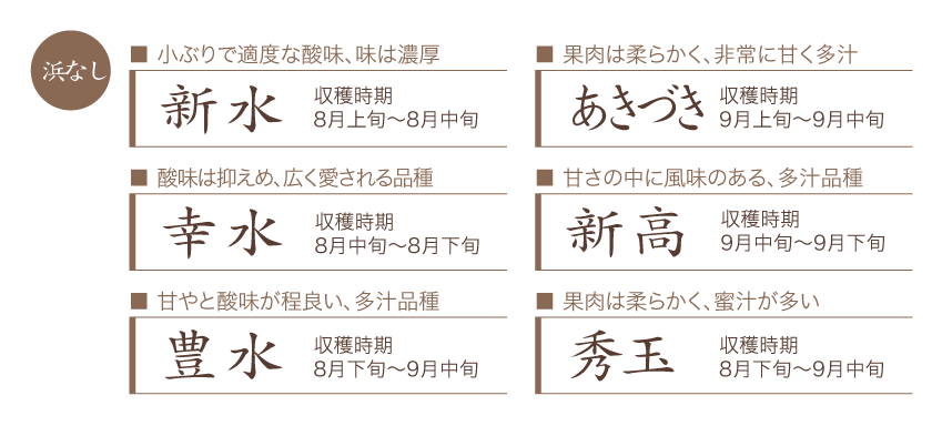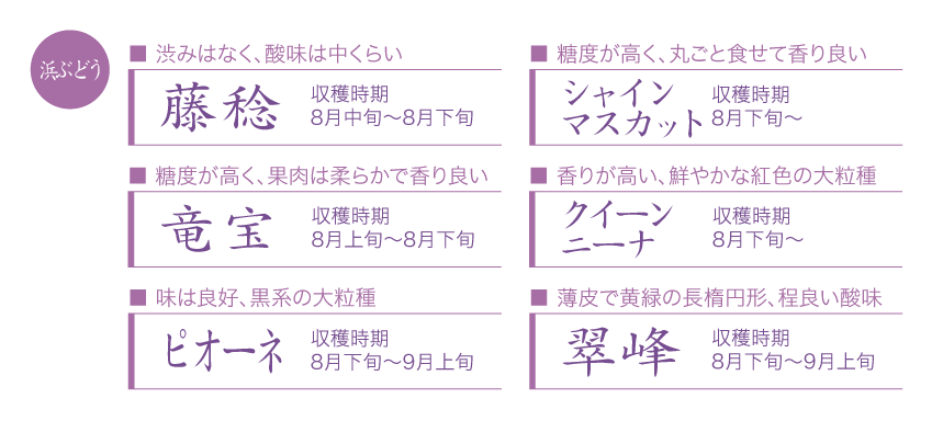 下記が「浜なし」「浜ぶどう」の主な品種です。